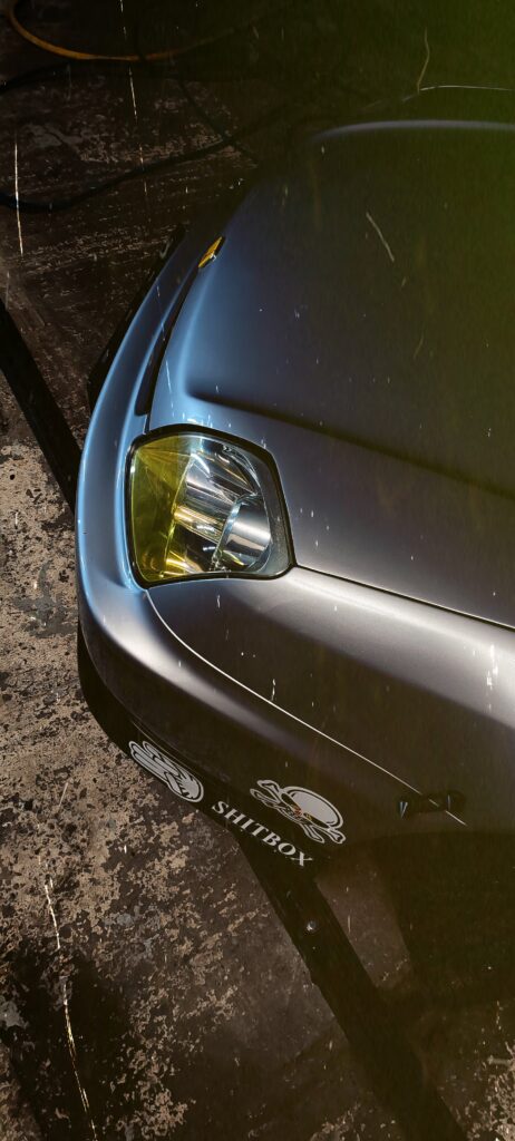 After a minor accident, I replaced the lights and hood. I was lucky because a tuning company went bankrupt right at that time, so I got a brand-new carbon hood for the price of a standard steel one. I chose classic silver headlights—they still look modern and elegant today.